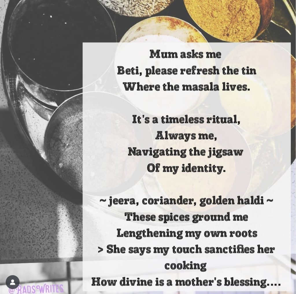 Mum asks me “Beti, please refresh the tinWhere the masala lives”. It’s a timeless ritual,Always me,Navigating the jigsaw,Of my Identity. ~Jeera, coriander, golden haldi~ These spices ground meLengthening my own rootsTo my ancestral home out of reach Mum says my touch sanctifies her cooking. How divine is a mother’s blessing… By: @RadsWrites – Radhika Manek