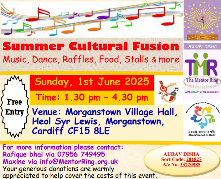A Summer Cultural Fusion event is taking place on Sunday 1st June 2025, 1.30 pm – 4.30 pm, at Morganstown Village Hall, Heol Syr Lewis, Morganstown Cardiff, CF15 8LE.