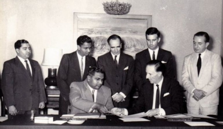 Header image with a red, green and white background, featuring a black & white image of Maldivian and British officials signing documents with the text 'The Maldives: 60 Years of Independence'.