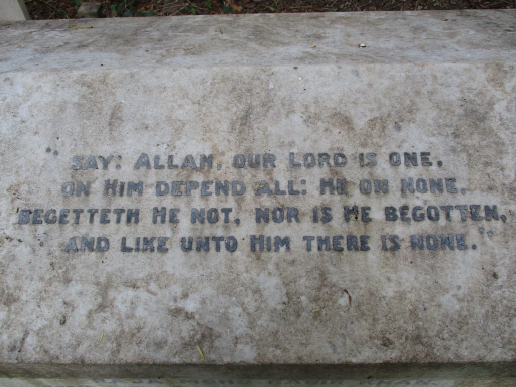 The inscription on the lid of the chest tomb reads: ‘Says Allah: Our Lord is one, on him depend all. He on none. Begetteth he not nor is he begotten’- A passage from Qu’ran 112:1-4.